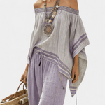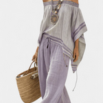 Bambusova bluzica s prugama, s otvorenim ramenima i širokim hlačama za elegantan i svjež stil