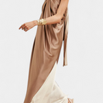 S dizajnom koji spaja senzualnost i modernost, haljina Petra ističe se svojim halter izrezom i potpuno otvorenim leđima. Njezina fluidna silueta, zajedno s igrom blokova boja, stvara elegantan i avangardan vizualni dojam. Savršena za one koji žele zasjati s povjerenjem na bilo kojem posebnom događaju.