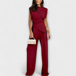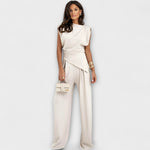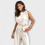 Skulpturalna elegancija s modernim dodirom: Set Sofija kombinira asimetričnu bluzu s širokim hlačama za siluetu koja je elegantna i teče s gracijom. Idealno za posebne prilike ili da unaprijedite svoj svakodnevni izgled bez napora.