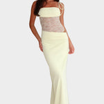 Izdignite svoju ženstvenost i eleganciju s ovom dugom haljinom u mekoj pastelno žutoj nijansi. Kombinacija fine čipke na dekolteu s uskim donjim dijelom stvara izuzetno privlačan i sofisticiran izgled, idealan za večernje izlaske ili posebne prigode.