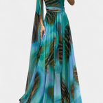Romantična i sofisticirana, haljina Nives unosi skulpturalni i ženstveni duh zahvaljujući izrezu s jednim ramenom i drapiranoj rukavi. Delikatni cvjetni aplikacija podiže dizajn, dok se maxi silueta fluidno kreće s gracioznošću, stvarajući nezaboravnu prisutnost na bilo kojem događaju. Izrađena od mekog i elegantnog materijala, balansira udobnost s rafiniranim glamuroznošću.