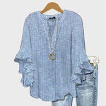 Izdignite svoj klasični stil s ovom majicom u plavoj nijansi s vertikalnim bijelim prugama. Njezin minimalistički dizajn kombinira eleganciju i praktičnost, dok rukavi s volanima dodaju ženstvenost i pokret. Idealna za svakodnevne izglede, ali i za formalnije prigode.