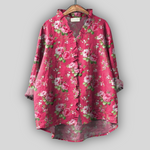 Romantična lanena bluzica u intenzivnoj ružičastoj nijansi s cvjetnim uzorkom ruža koja isijava ženstvenost i eleganciju. V-izrez s diskretnim volanima i slobodan kroj pružaju udobnost i prozračan osjećaj, dok asimetrični rub s dužim stražnjim dijelom dodaje moderni karakter svakoj kombinaciji.